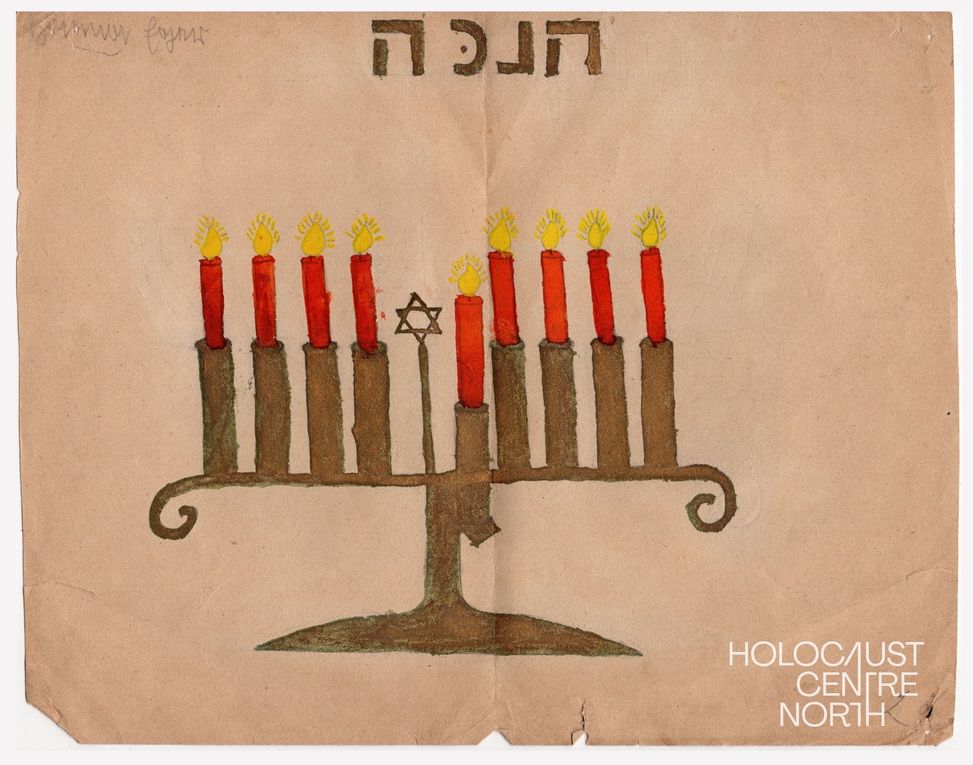 Beautiful illustration created by 11-year-old Hanna-Ruth Eger for her first Hanukkah in England, 1939. The Hebrew title is 'Hanukkah' (although one letter is missing), and all the candles are lit, marking the final night of the festival.
