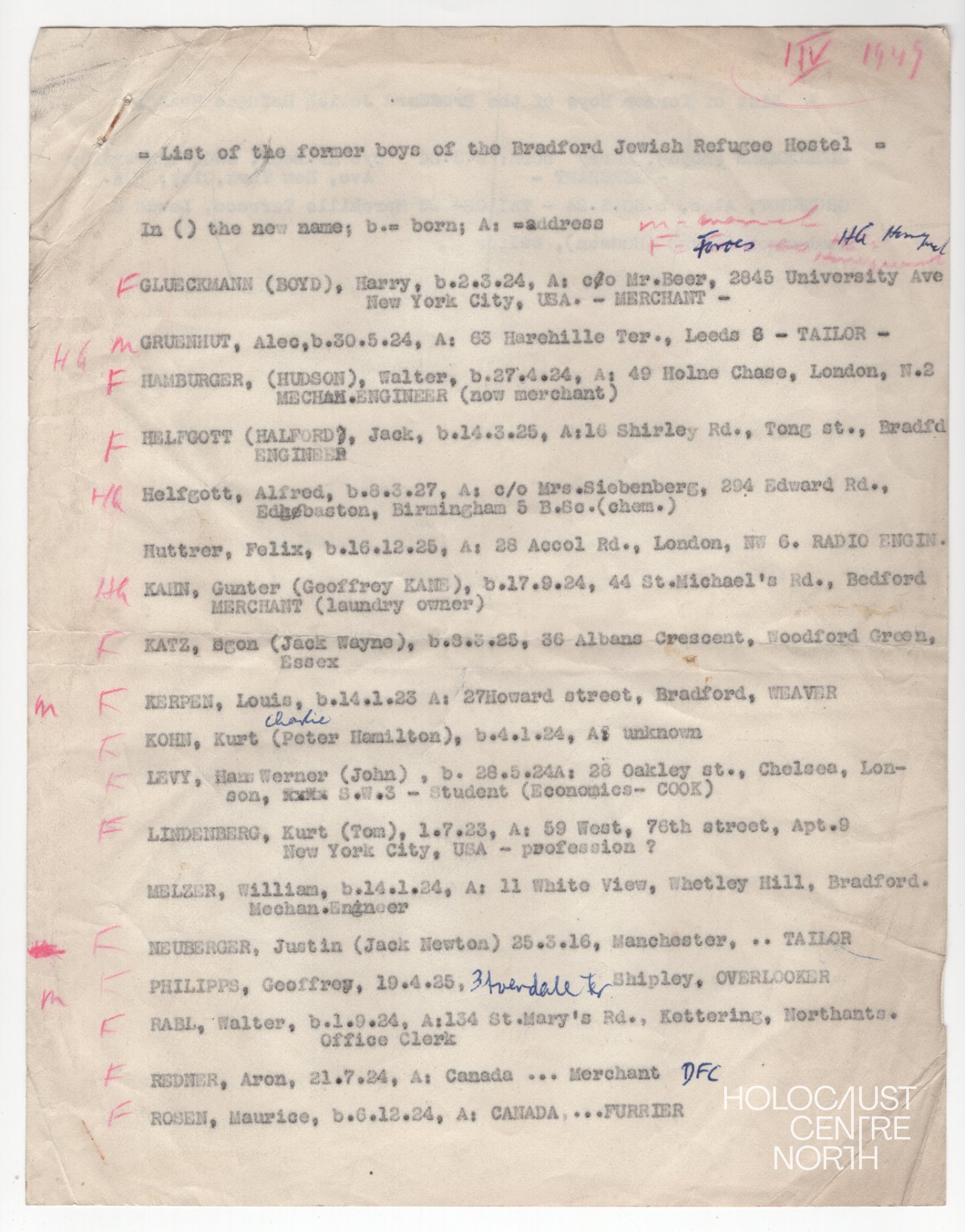 List of the “former boys” as of 1949, showing their old/new names, birthdays, addresses and occupation as well as whether they were “m” for married, “F” in the armed forces, or “HG” with the Home Guard.