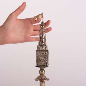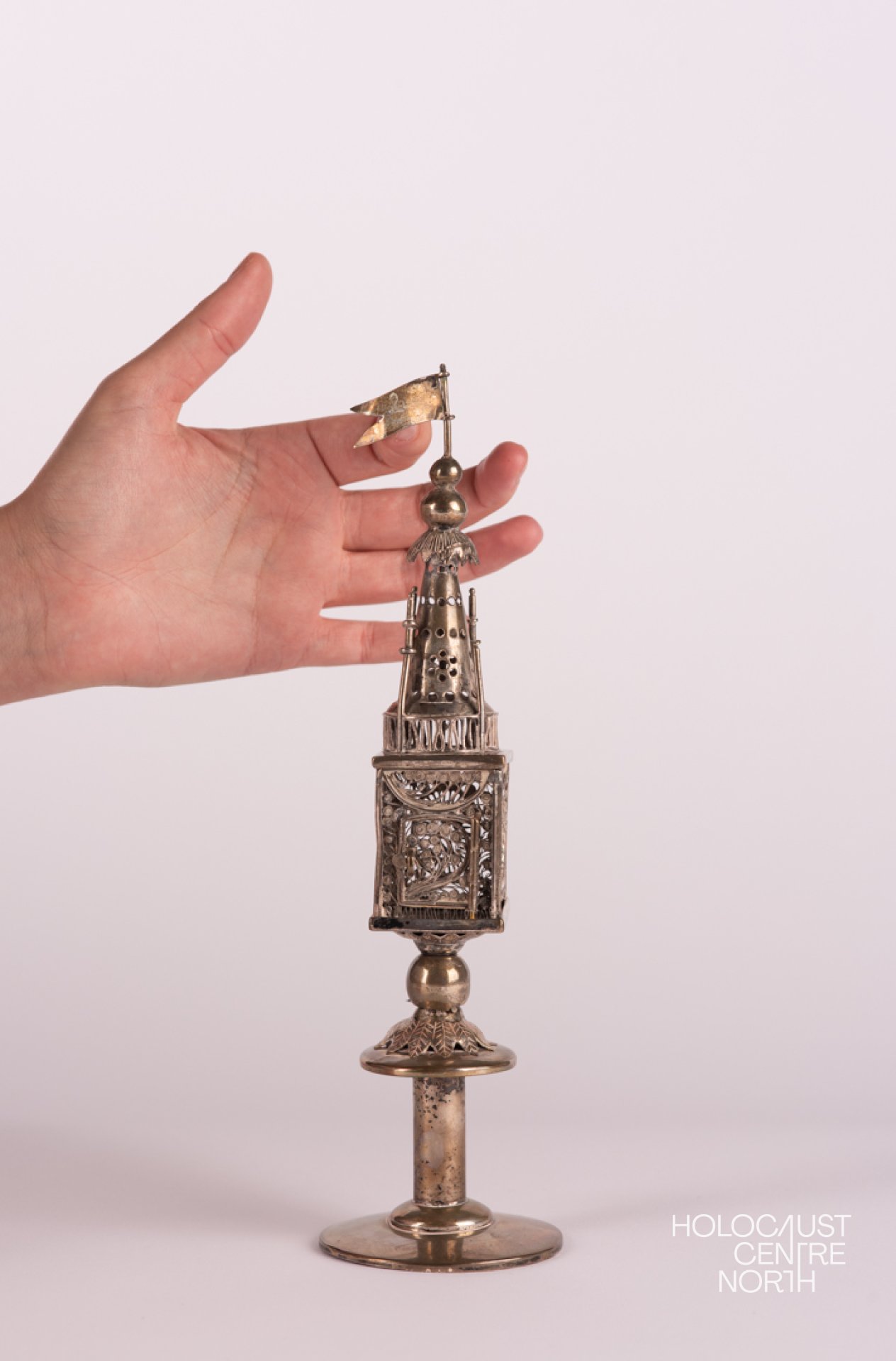 Ornate spice box to be filled with fragrant spices and used during the Havdalah ceremony to close Shabbat. It was brought by Marianne Leavor from Germany in 1939.