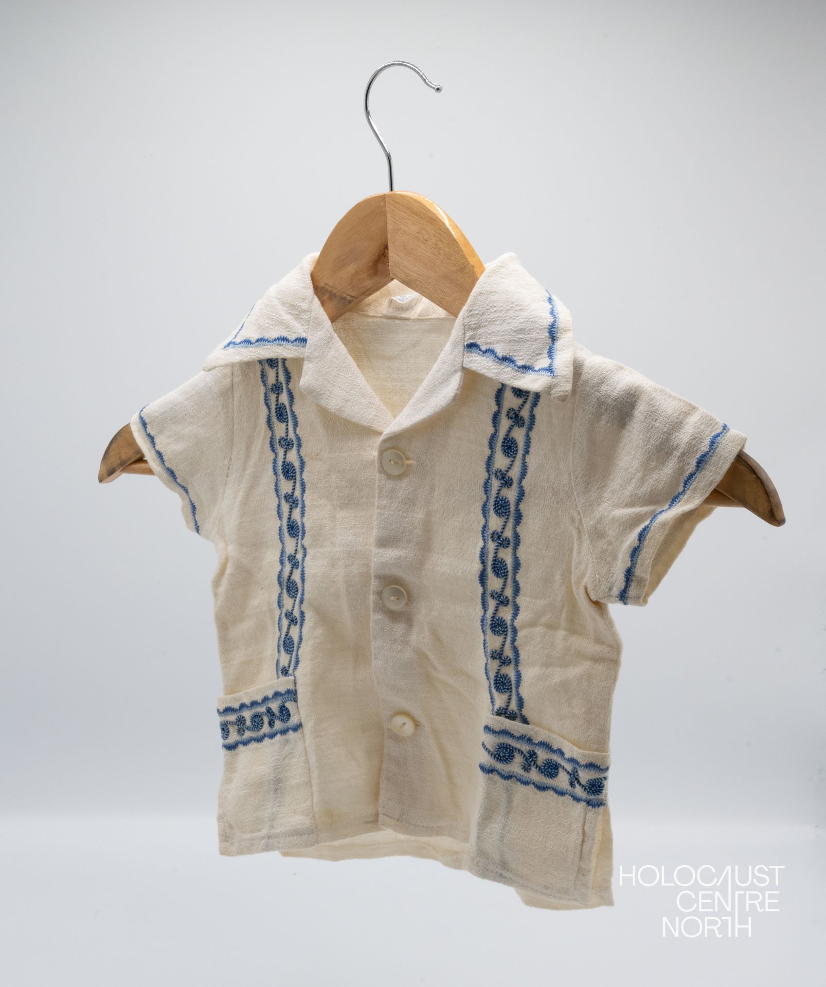 Embroidered shirt, one of several children’s outfits the Kubie family brought from Czechoslovakia to England for their young sons.