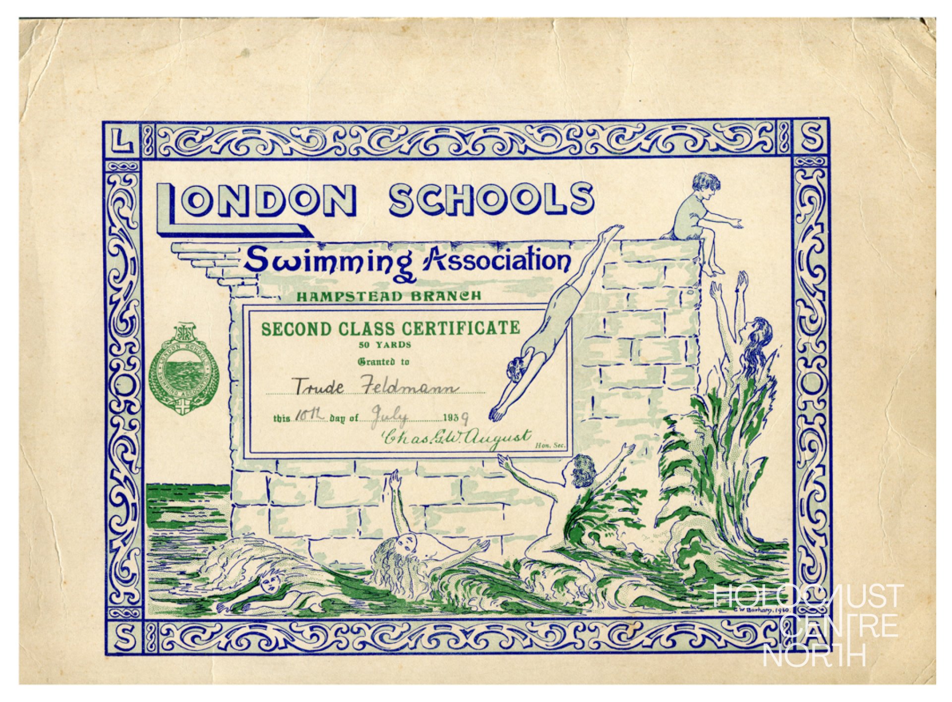 Beautifully illustrated swimming certificate awarded to the ever-accomplished Trude Feldmann shortly after her arrival in England in 1939.