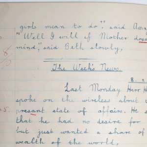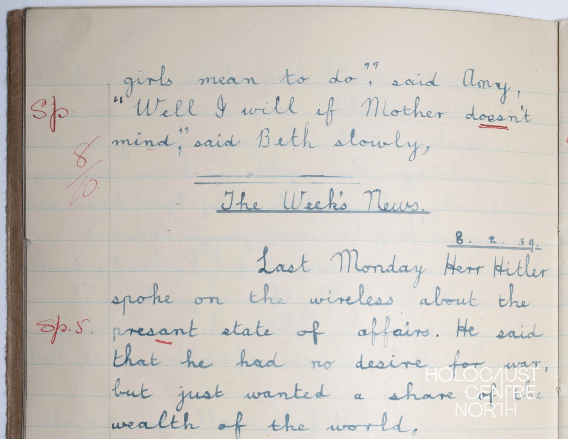 School pupil Yetta Rosenberg’s account of the week’s news in February 1939, in which she notes that “Herr Hitler” said that he had “no desire for war but just wanted a share of the wealth of the world.”